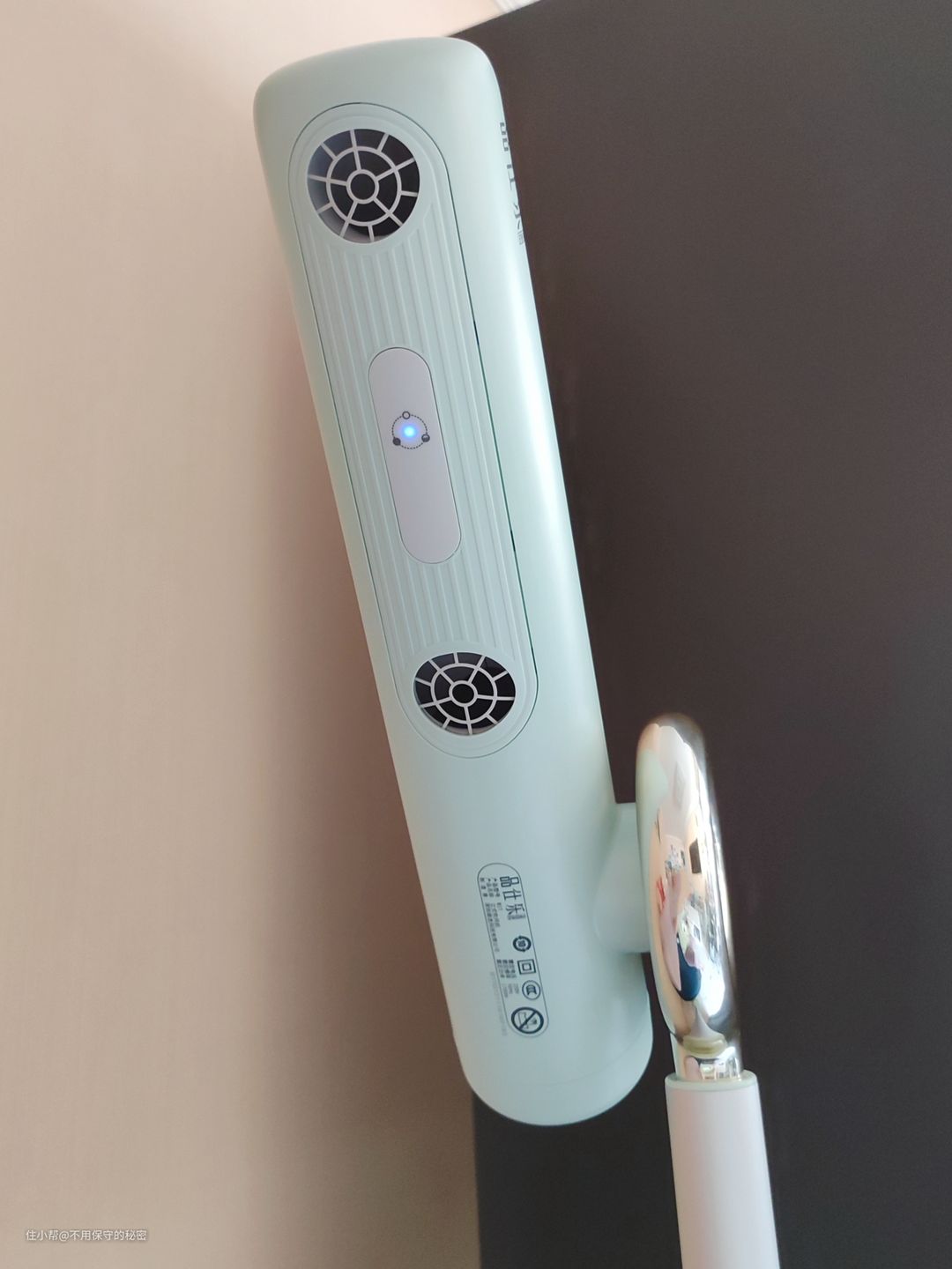 品仕乐立式吹风机主机长约37cm,直径约7cm,前端是总电源开关,使用前按下电源开关,吹风机会发出“哔”一声,然后就可以通过遥控器来远程控制了。