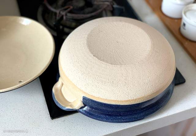 锅盖的凹槽处设计很有记忆点,方便放勺子锅铲,旁边的圆形气孔可以保持锅内热压平衡。锅盖内侧是冰裂纹釉面,底部没有施釉,多孔质感保留了土锅特色风格。
