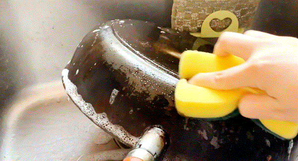 清洗时对懒人也非常友好,炒完菜用水一冲,厨房纸一擦就搞定了!而且仗着它有特殊保护涂层,我经常偷懒,隔好久才给它清洗一下外层锅面。只需喷上去油污神器静置十几秒,这些顽固油污轻轻一擦就掉了,神奇吧!