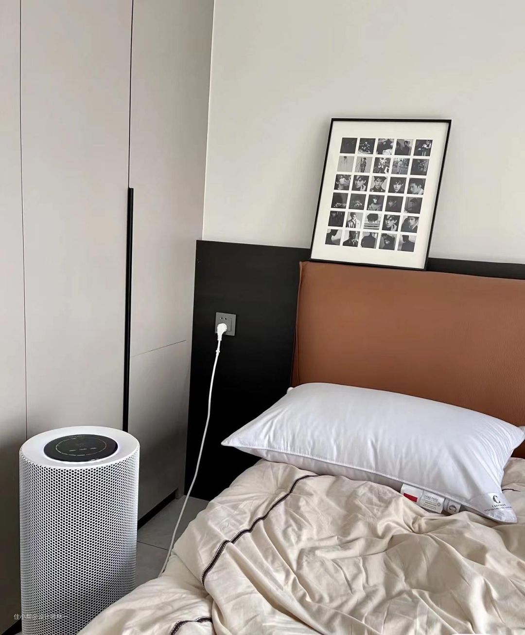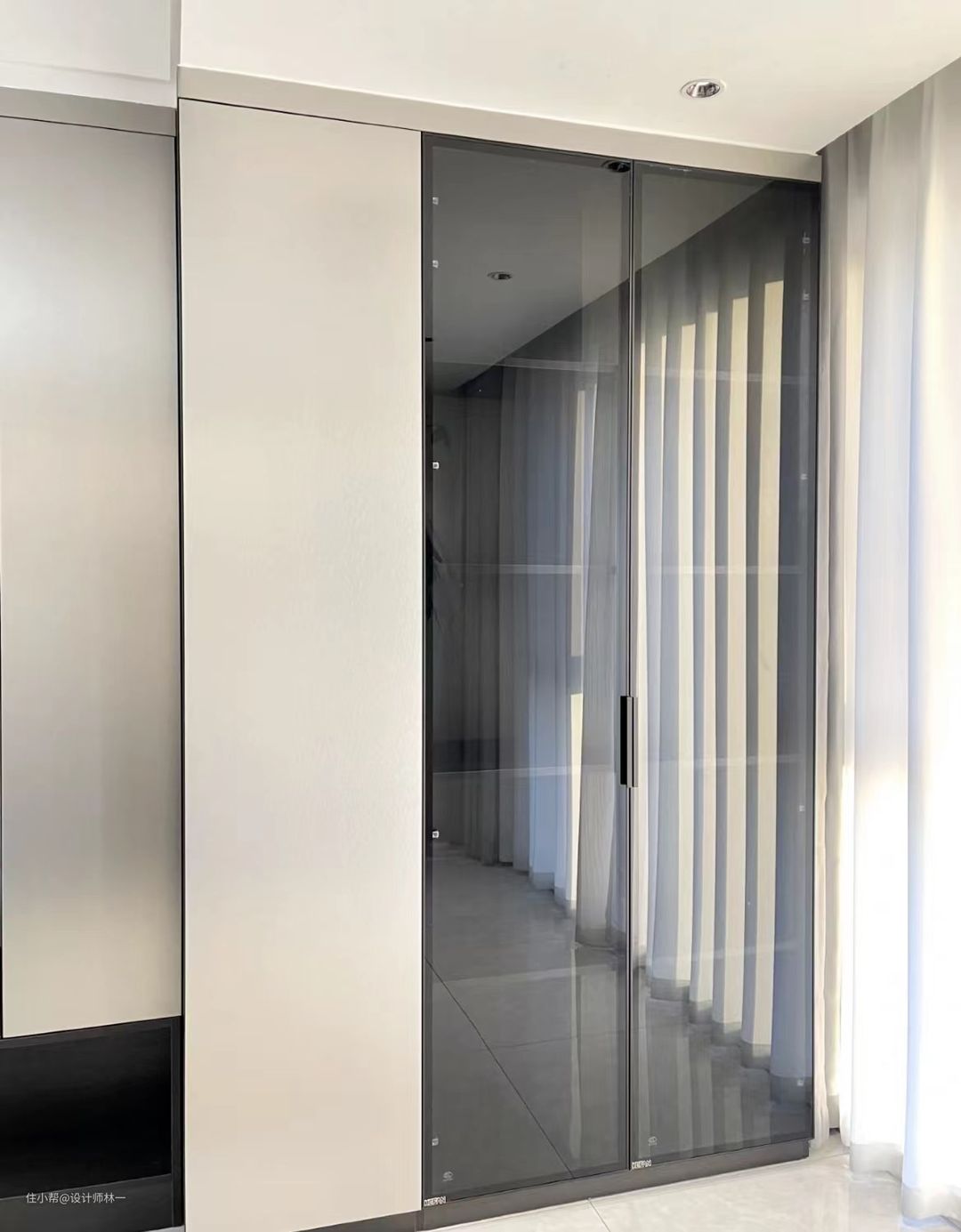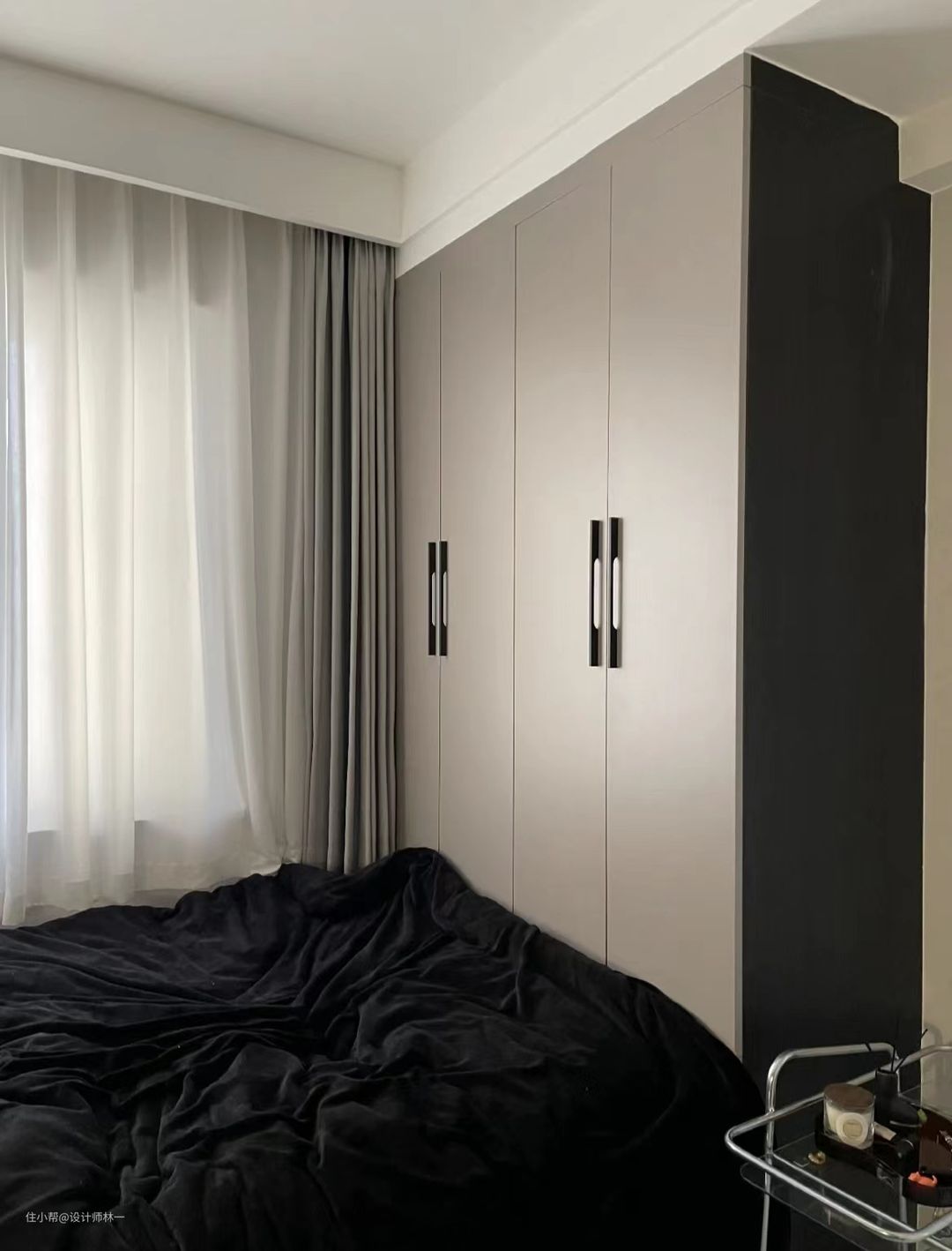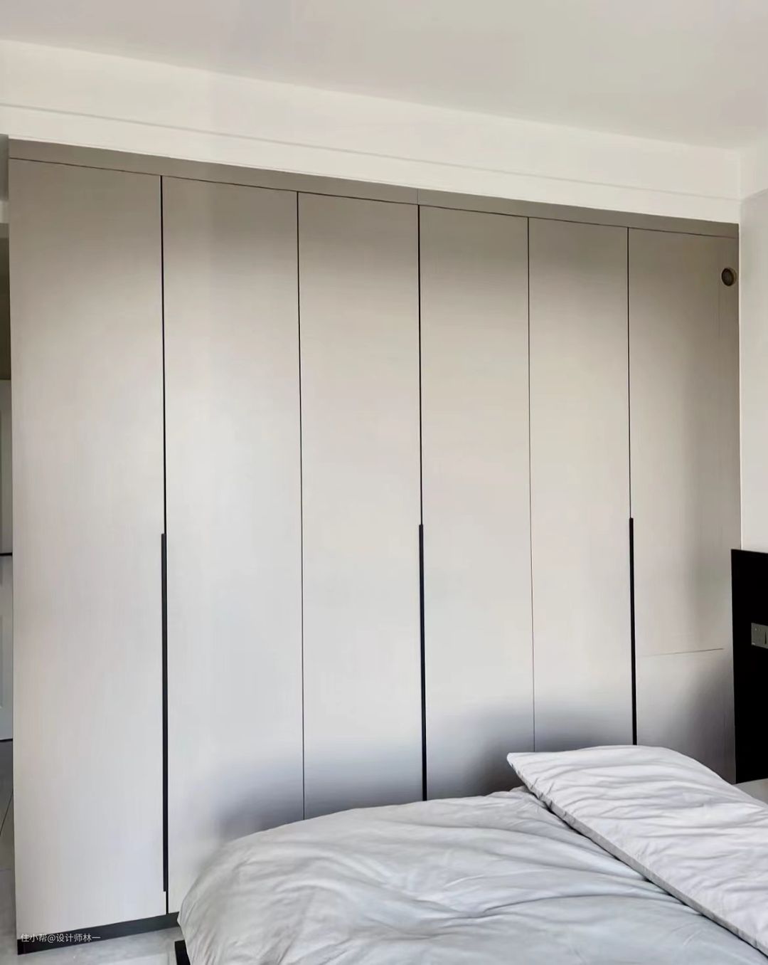 一门到顶的柜子一定要装拉直器,否则久而久之绝对会变形,到时很麻烦,柜子的五金一定要用最好的,不然后期会有糟心的体验感,最重要的一定就是要测量好床与柜门之间的距离,否则做出来卡住了就很尴尬。