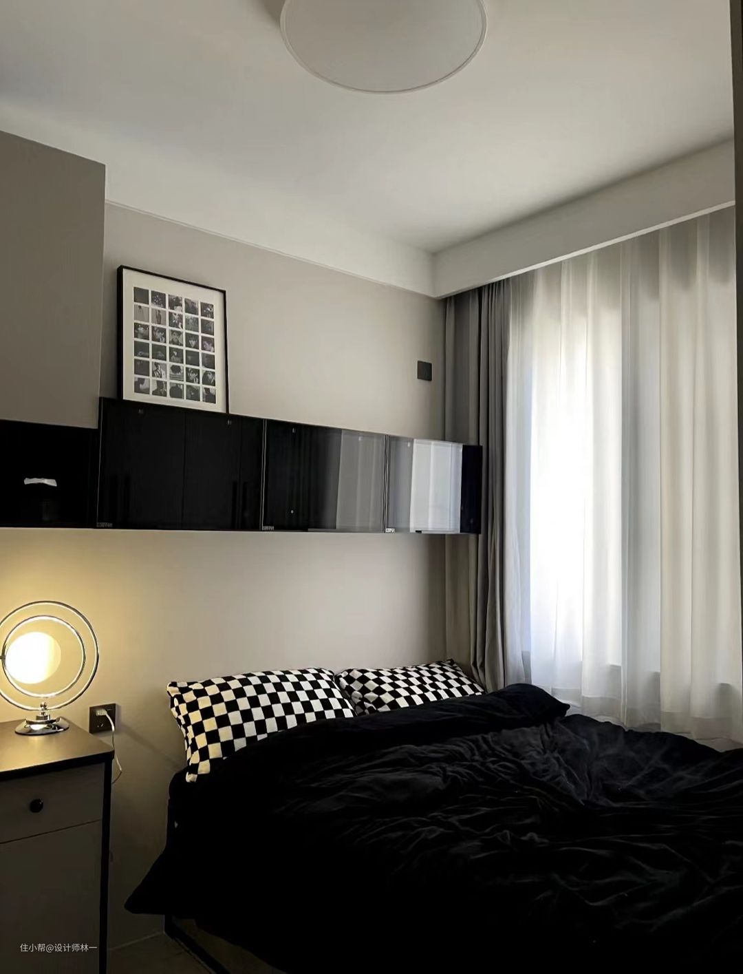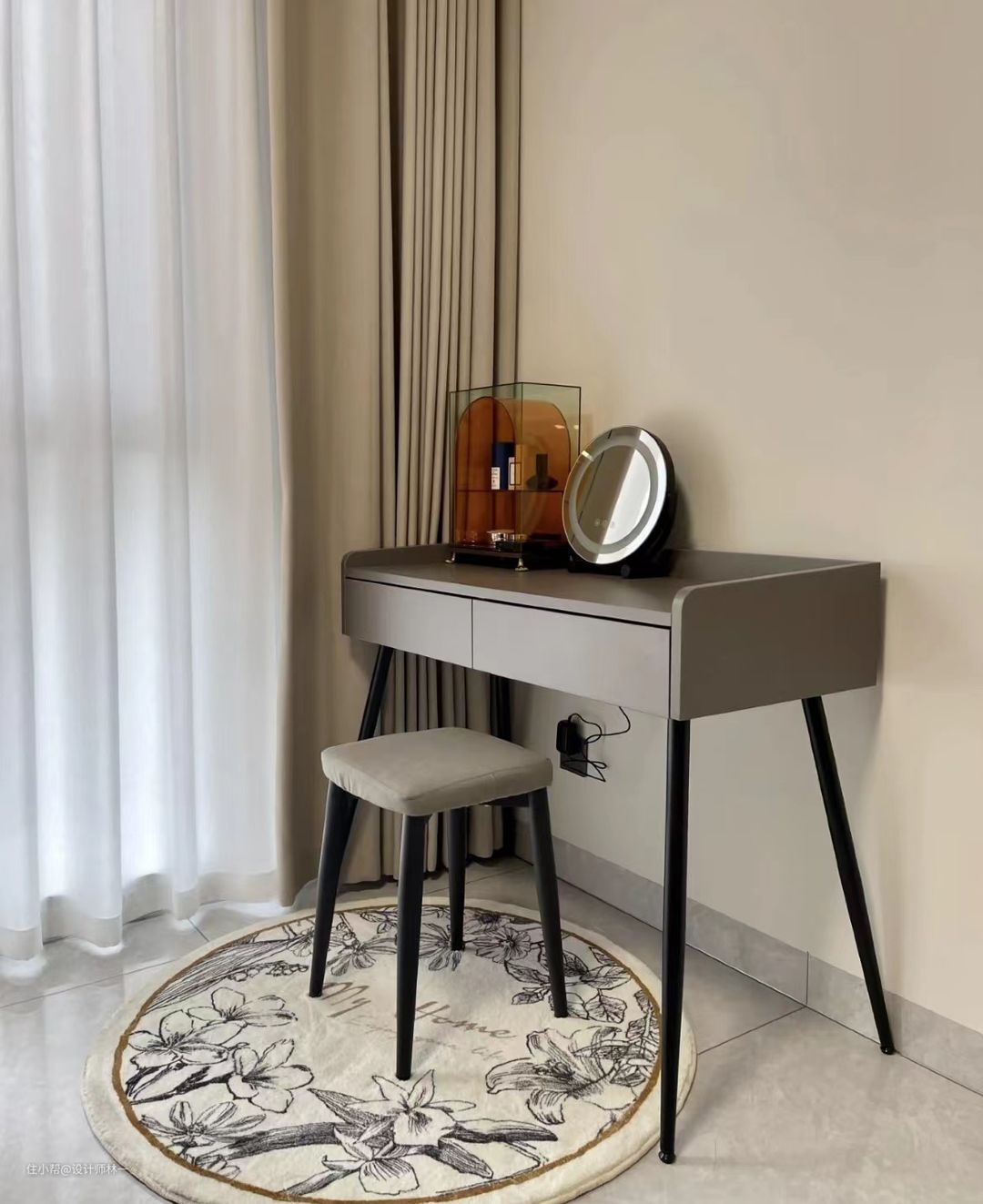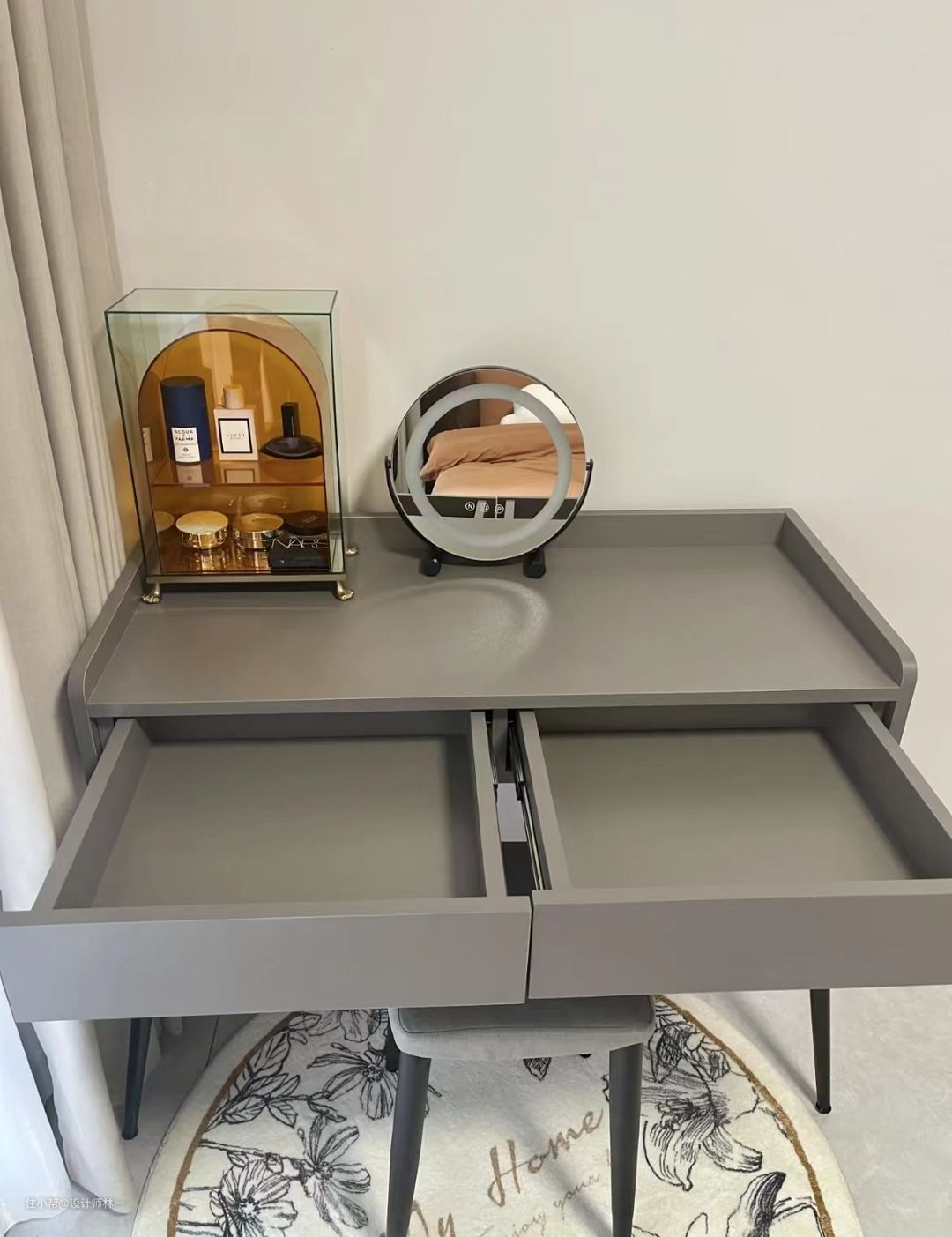 床位放置了极简梳妆台,不管是颜值还是性价比都很高,深灰色蔓延着高级感,搭配智能化妆镜小巧又可爱,还很实用。