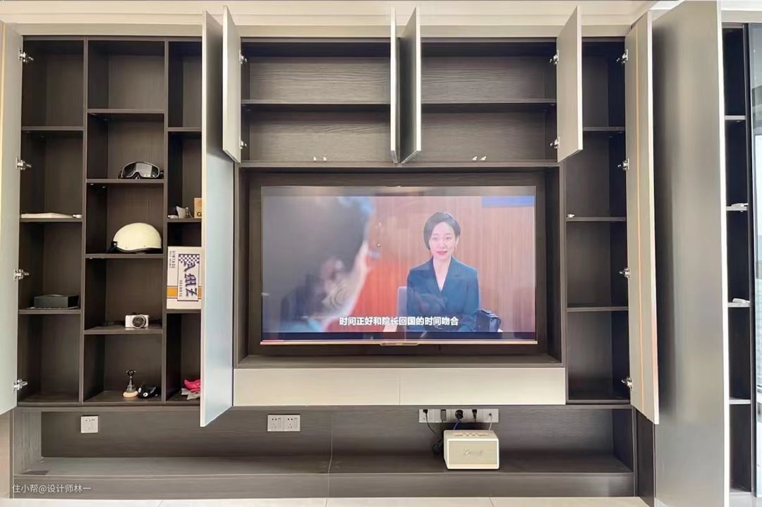 电视背景墙做了又好看又实用的定制电视柜,柜门是巴斯钛银,会根据不同的光线呈现出不同的颜色,高级感十足。