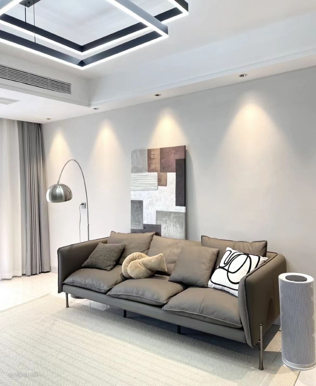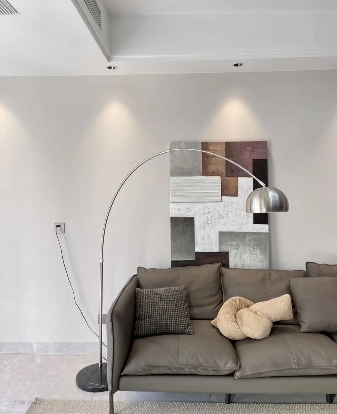 丙烯画纹理感的装饰画,颜色不花哨,银色的钓鱼灯给人非常沉稳的感受,整体与客厅非常搭配,透露着十足的高级氛围感。