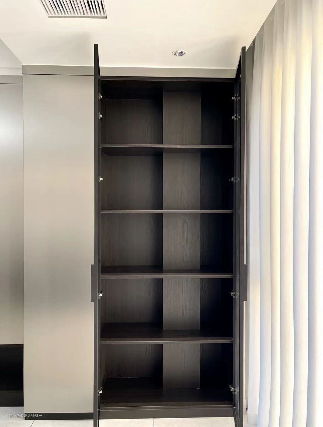 定制了一门通顶的衣柜,颜色是月光灰,材质是肤感材质,内部与柜边用的是黑橡木,搭配起来毫无违和感,整体就是高级感十足,同时哑光不锈钢的长把手的设计非常大气。