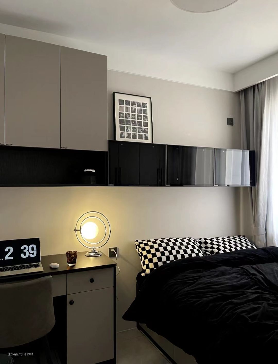 柜子都是全屋定制的,面板是月光灰,床头上方的柜体使用了透明玻璃柜门主要是想以后续放置手办等物件,提升空间的档次,凸显屋主的气质与格调。