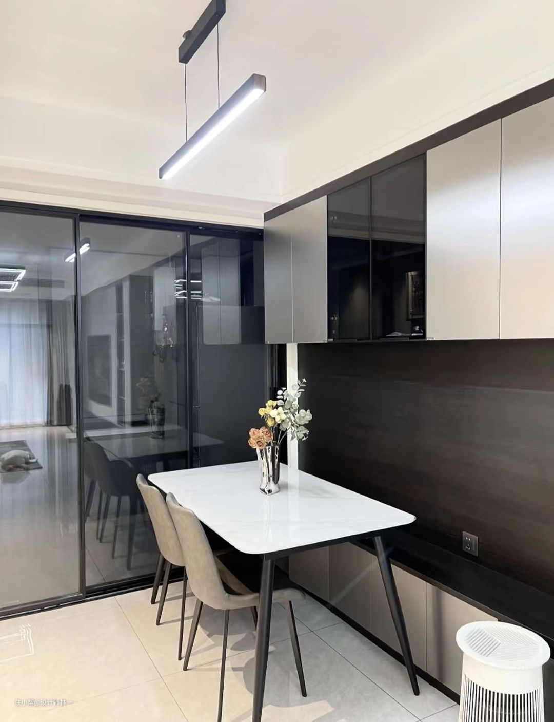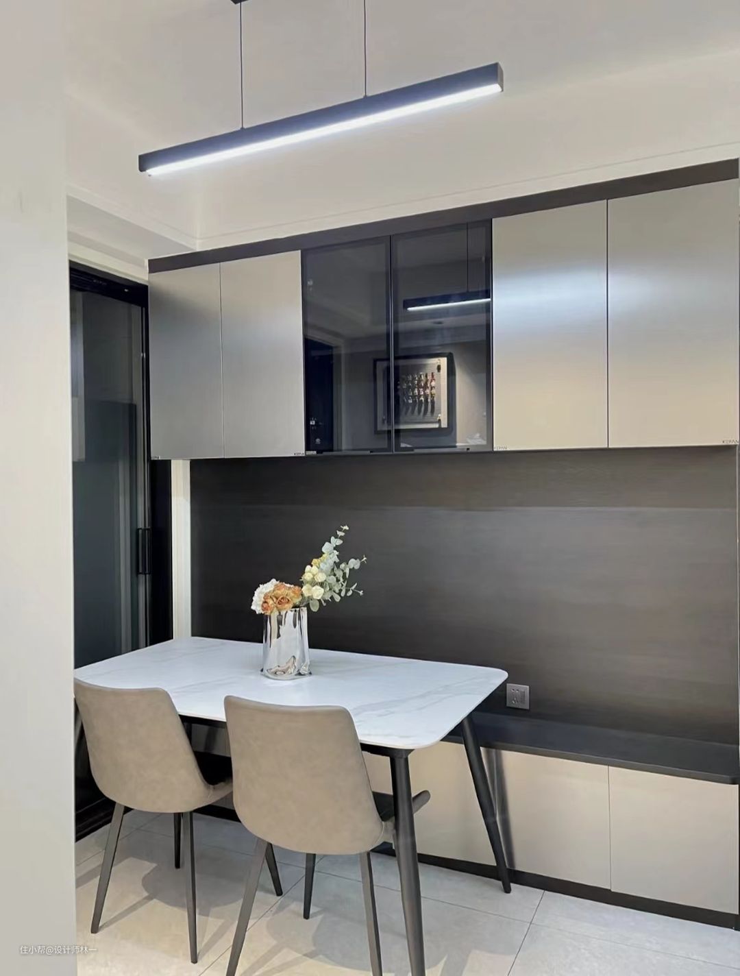 餐厅一般都靠进厨房,考虑到国王的宽度、空间利用的问题,为了使用感更加舒适,定做了柜椅一体两用的餐柜,不仅达到实用性,也不影响美观性,还显得餐厅更大,柜体是按照家人们的平均身高定做的,平常在家就女主和闺蜜,不会有碰头的情况发生。
