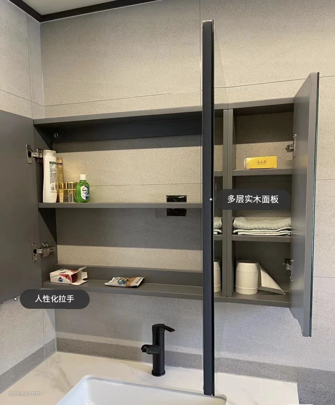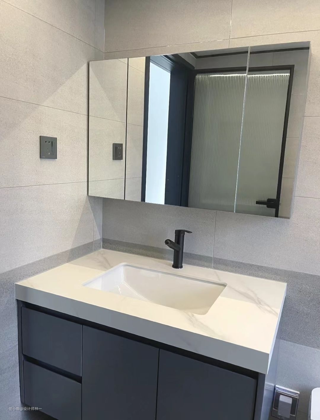 浴室柜是岩板的台面,抽拉式的水龙头,深灰色肤感的柜门,整体非常高档,高级感十足。