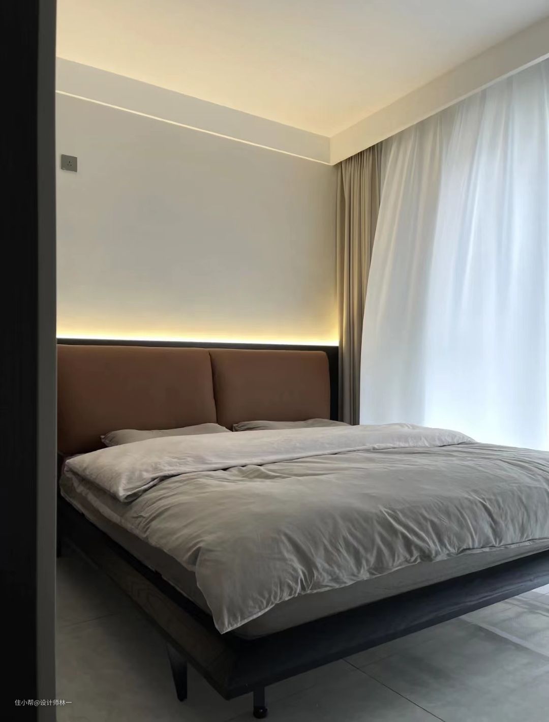 主卧以灰色调为主,墙漆搭配的是偏温柔的杏子灰,让房间没这么压抑,床头内嵌了灯带,营造氛围感十足的空间感,窗帘是奶茶色系的窗帘,让空间多了一分温柔的气息。