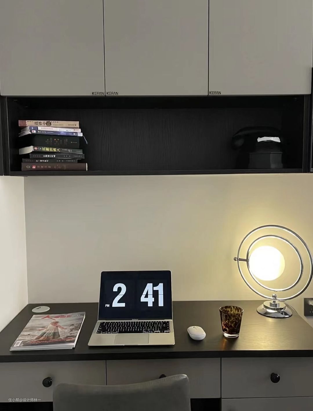 书桌上方设计了开放格,可以收纳书籍也可以放置装饰物,视觉上一目了然让拿取与收纳都更加便利。