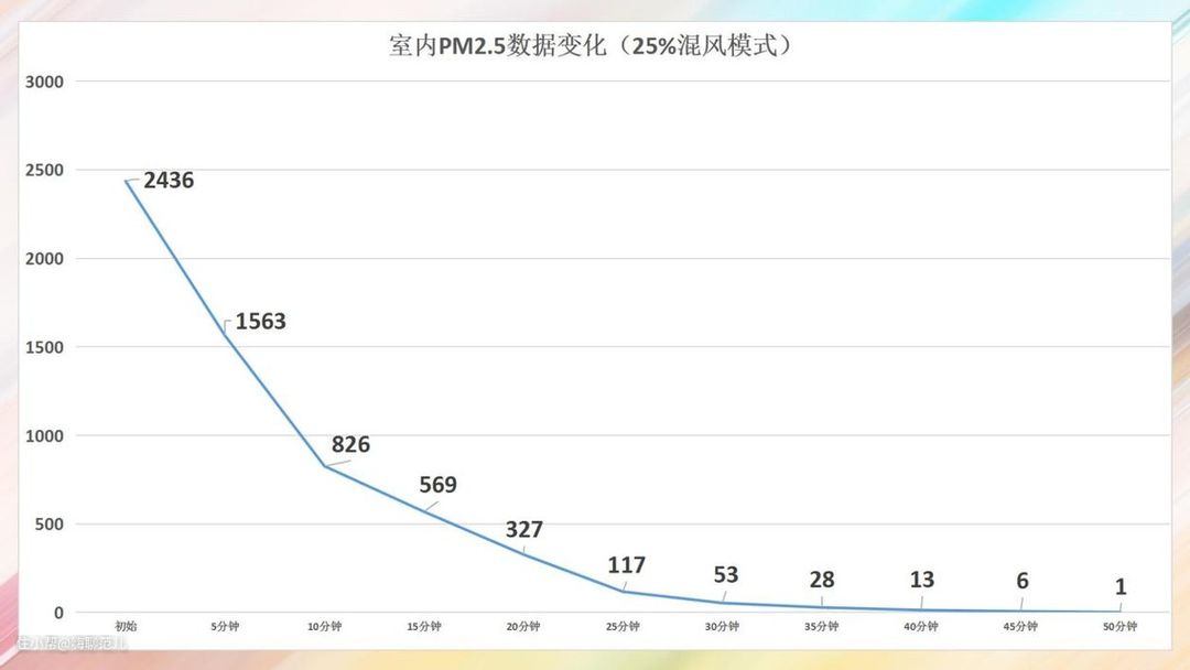 ▲将机器的运行模式调整到25%混风,此时进行一个相同的测试流程,从数据趋势图中可以看到在混风模式下进行净化时的净化效果、速度要比100%新风机模式下更给力一些。