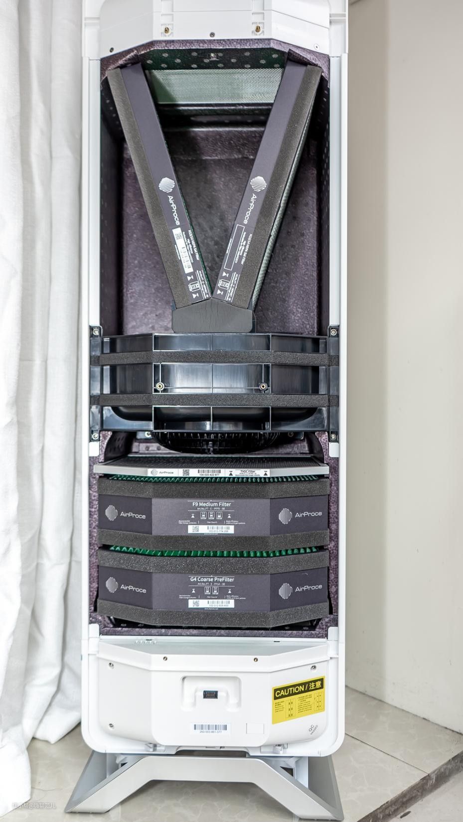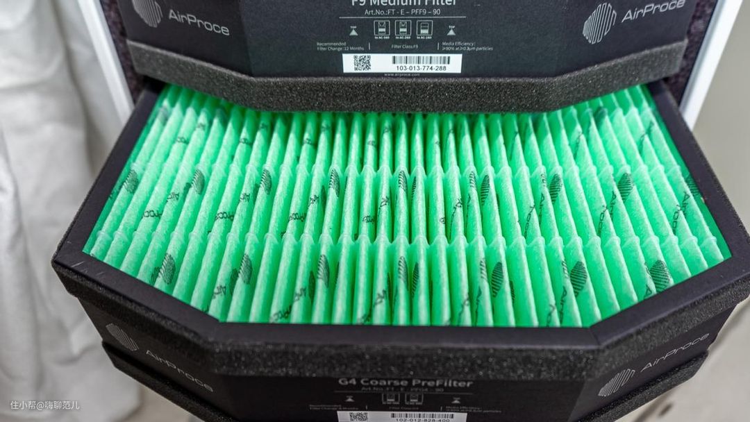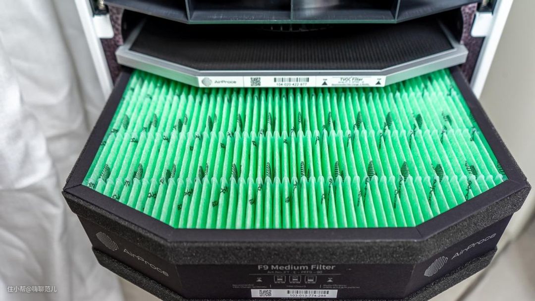 ▲本款机器的第3层过滤为一个非常给力的F9中效滤芯,它同样采用了进口3M滤材,展开面积将近3㎡,所以带来了更高的容尘量,在日常机器运行中可以有效地过滤二手烟、扬尘等。