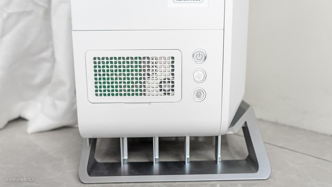 ▲在机身左侧的底部位置,是这款机器的传感器所在区域,日常使用时正是通过这个装置来准确识别室内PM2.5、CO₂等数据。此外,在传感器旁边还预留了三个实体按键,通过它们可以进行开关机、调整模式、调节风力以及联网等操作。