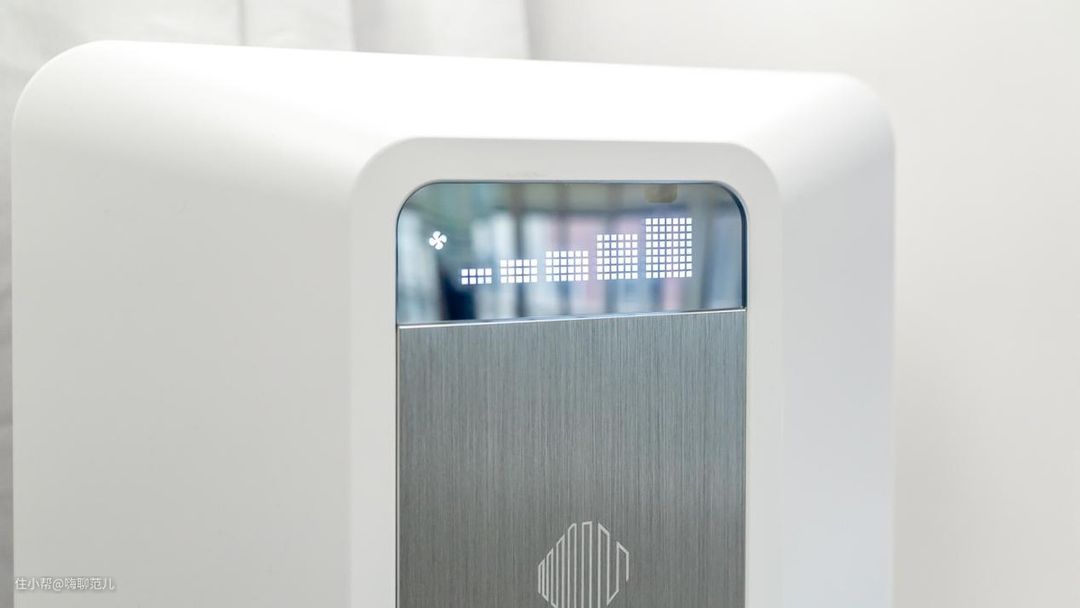 ▲在机身正面的顶部区域,可以看到一块大面积的银镜点阵显示屏,在机器运行时可以精准地显示机器的运行模式,以及实时显示当前室内环境的PM2.5、CO₂等数据,可以让用户很直观地就能够了解到室内的空气质量。
