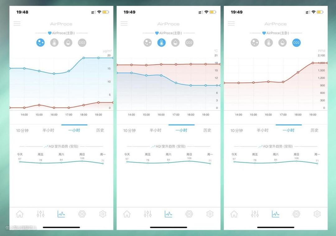 ▲要想更多地了解室内空气质量的详细变化及机器的净化效果,那么在手机APP里面的趋势图页面就可以查看到,在这个页面里就可以查看到多项指数的变化趋势图,每项数据都可以根据每十分钟、每半小时、每小时等多个范围的趋势图,各项数据都特别地直观。