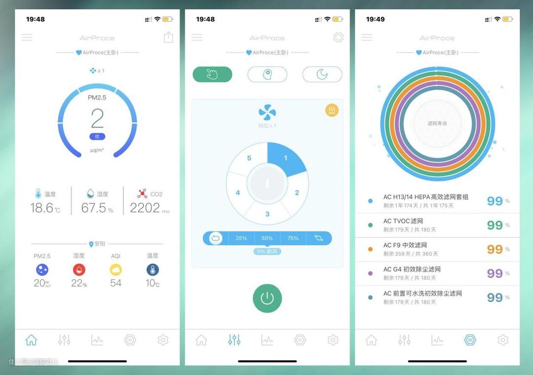 ▲AirProce艾泊斯AC-260壁挂新风机这款机器还支持手机APP远程智能操控,在手机上安装配套的AirProce然后扫描机身的二维码再经过简单几个步骤就可以绑定完成,之后就可以在手机APP内查看室内空气质量各项指数、湿度等数据,还可以进行风量调节、模式调节等多种操控、查看滤芯使用情况等。