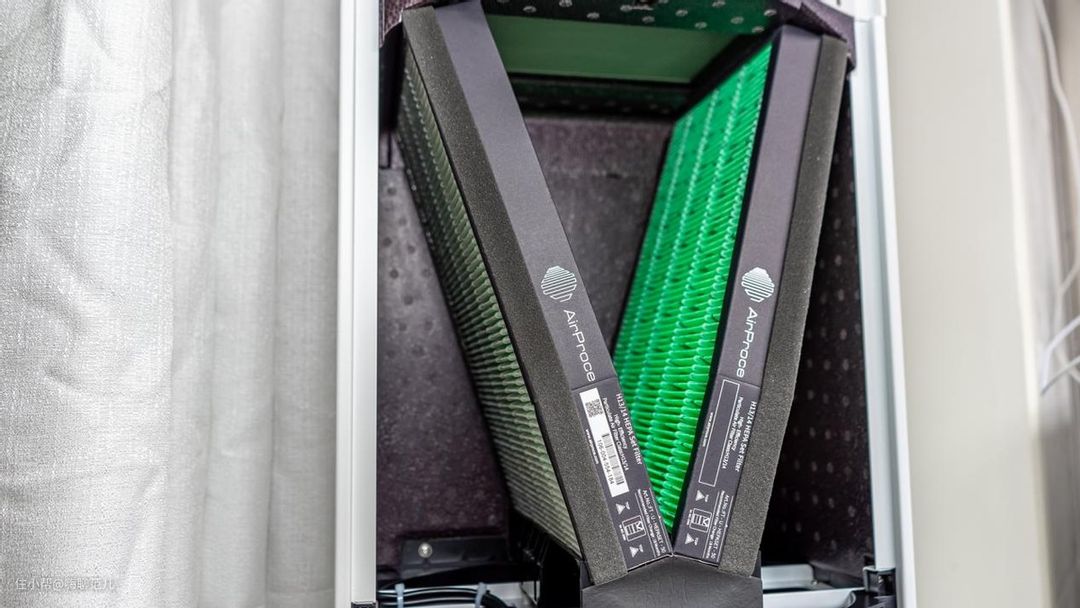▲在过滤系统的最顶部,是呈V字型摆放的H13/14 HEPA滤网套组,也就是第5层过滤,它们采用了进口3M滤芯,在日常使用时可以实现PM0.3以上颗粒的过滤效率≥99.97%,此外,它们的表面采用了复合抗菌涂层,除菌率可达≥99.99%,整体表现还是挺给力的。