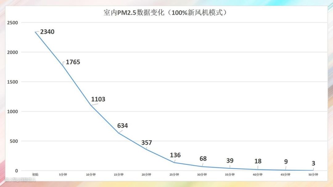 上图是记录的PM2.5的数据变化,记录间隔为每五分钟一次,从测试结果所呈现的数据走向可以看得出在新风机模式下艾泊斯AC-260壁挂新风机净化室内PM2.5的效果非常的不错,从最初的2340μg/m³到数值降低至3μg/m³仅用了不到一个小时时间,速度还是挺快的。
