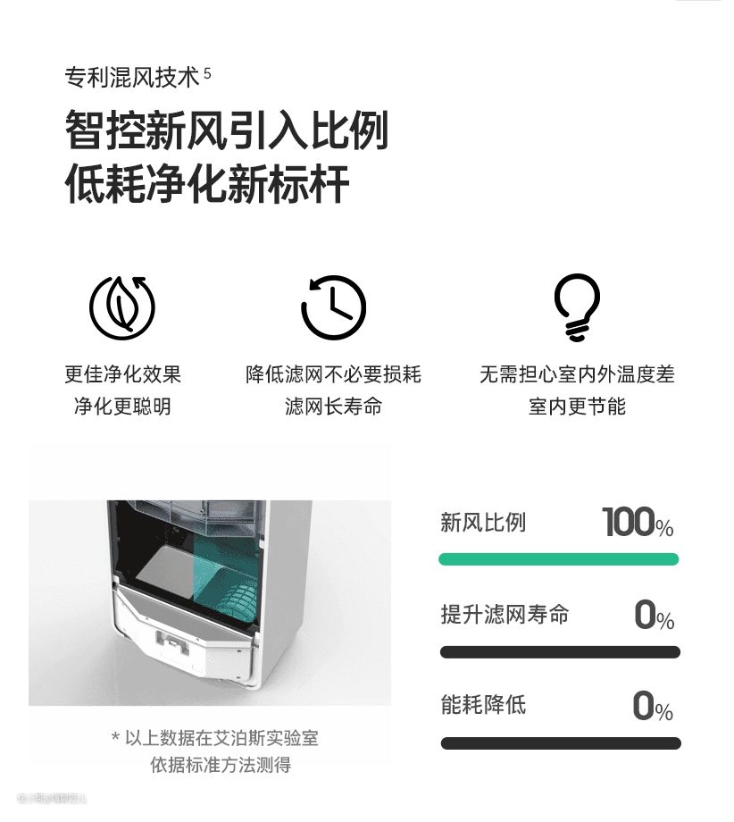 ▲在机器的内部除了可以看到诚意满满的5层递进式过滤系统,还可以看到它所配备的EBM德国进口EC风机,它的最大净化功率为58W,它最大的优点就是特别省电,从官方的数据来看机器5档风量无辅热全天候运行24小时的话仅需耗费1.4度电,可以说非常地省电了。