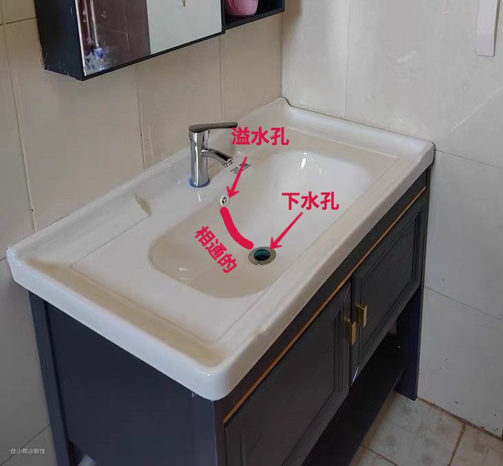 其实,它是个溢水孔,而且是和下水孔是通着的,如果洗手盆内水位到达这里,就会从溢水孔排到下水孔,再从下水孔处侧边的排水口排出,防止蔓延。