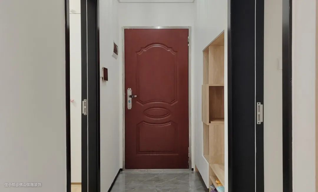 大红木门的颜色比较深沉,给人的感觉比较沉闷压抑。如果其他装修与家具选的颜色比较浅的话,会压不住大红木门,使得大红木门成为一个“抢眼却碍事”的存在,整体空间的设计效果就不和谐了。