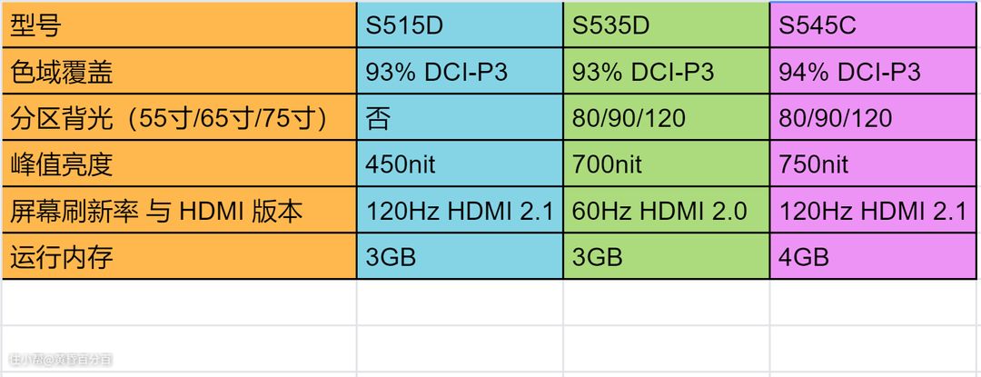 ▲为了方便大家理解,我在表格里只保留了几款电视不同的参数。