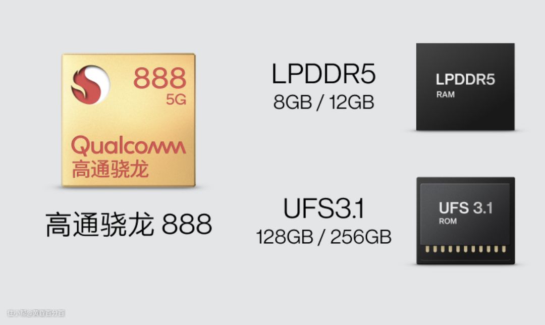 ▲硬件方面,一加9 RT采用的是高通目前最新的旗舰5G SOC 骁龙888,采用三星 5nm 工艺制成 , CPU 采用 1 x 2.84GHz (ARM 最新 Cortex X1 核心)+3 x 2.4GHz (Cortex A78)+4 x 1.8GHz (Cortex A55),GPU 为 Adreno 660,采用 X60 5G modem 基带,支持 WiFi 6E、蓝牙 5.2,内存与储存则采用了8GB/ 12GB的LPDDR5内存与 128GB/256GB的UFS 3.1。