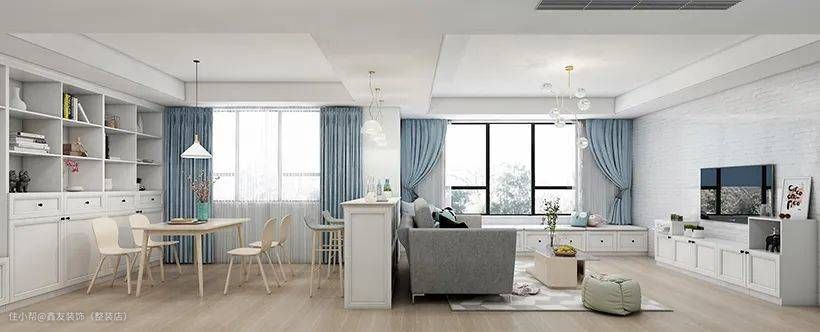 很多讲究坐着要有靠山,沙发不靠墙,感觉不踏实。这时,可以选择在客餐厅中间砌个矮墙,然后沙发靠着矮墙布置,既能缓解不踏实的感受,又能保持空间的通透大方。