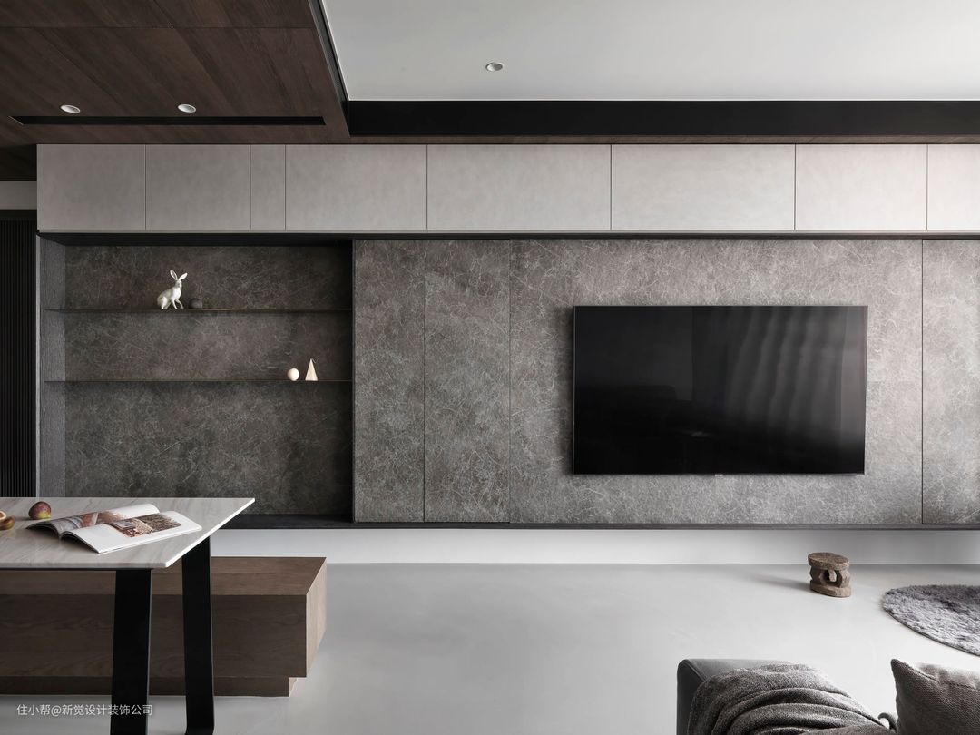 深色大理石通铺的电视背景墙整体感十足,左侧预留开放格兼顾展示作用,更适合现代风、侘寂风的装修