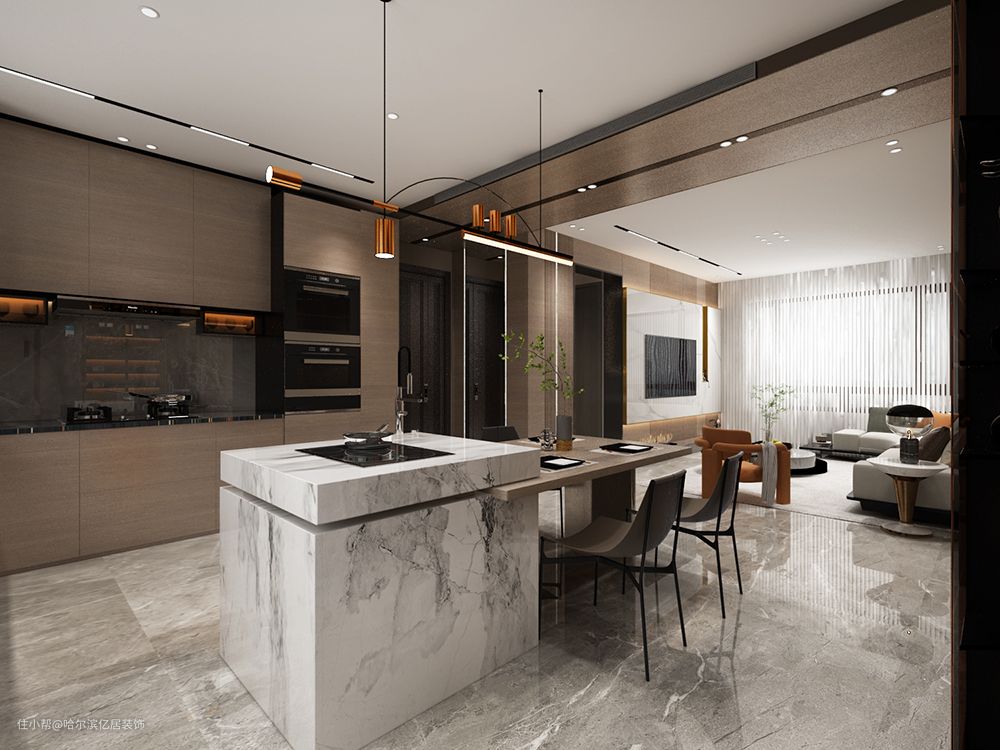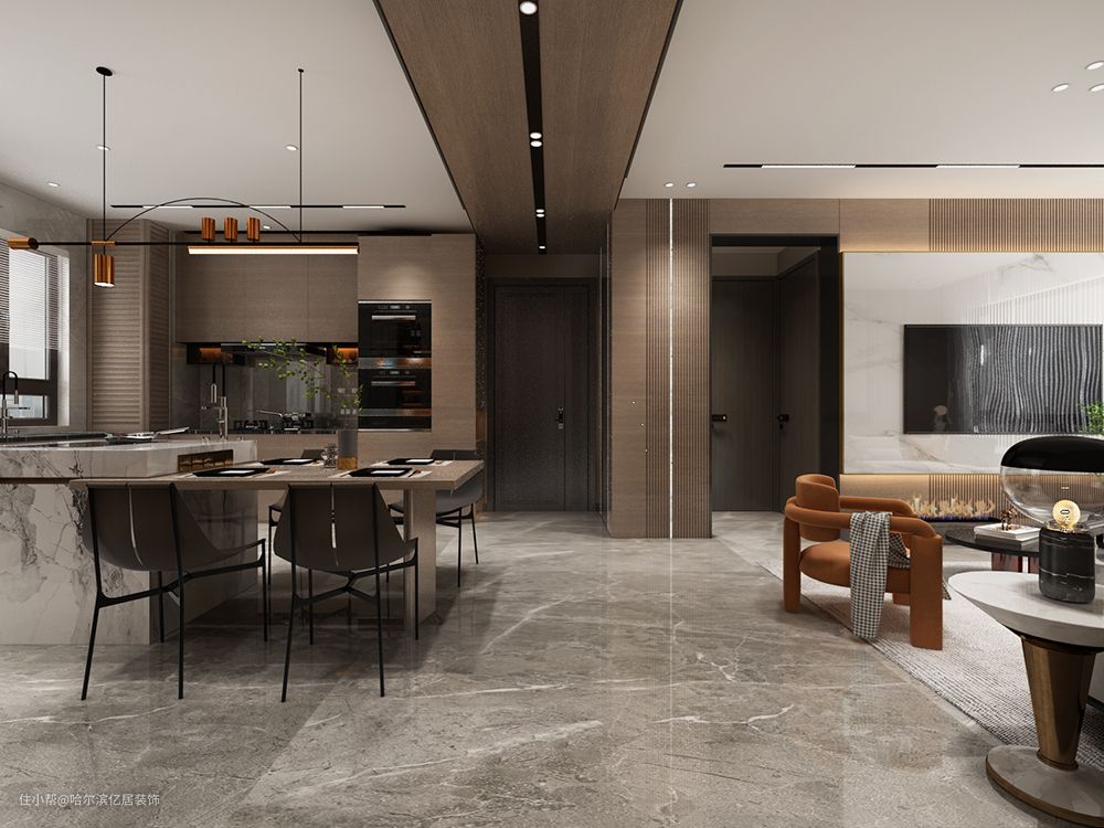 乐享时光,隐奢之家 哈尔滨汇智环球金贸城现代风装修哈尔滨亿居装饰2021-12-12客厅给人的第一印象是时尚与简约,整个空间也是围绕着以上两点进行设计的。— 客厅 —— 餐桌 —— 厨房 —— 洗手池 —— 卧室 —— 卫生间 —
