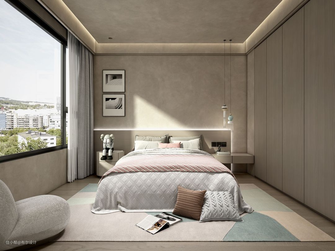 卧室规避所有浮夸繁复的装饰,没有多余的装饰,做到了极致简约。房间的配色比较柔和,在阳光的加持下,给人的感觉比较温暖放松。