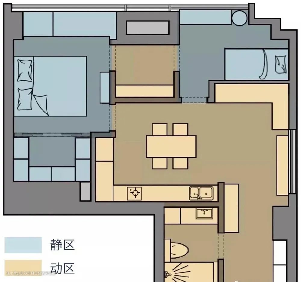 以主人一天的居家活动来讲,经常走动经过的地方叫动区,比如白天活动的区域,包括客厅、餐厅、厨房、卫生间、阳台等;静区主要指需要安静氛围的活动区域,基本上就是卧室、书房、衣帽间等区域。