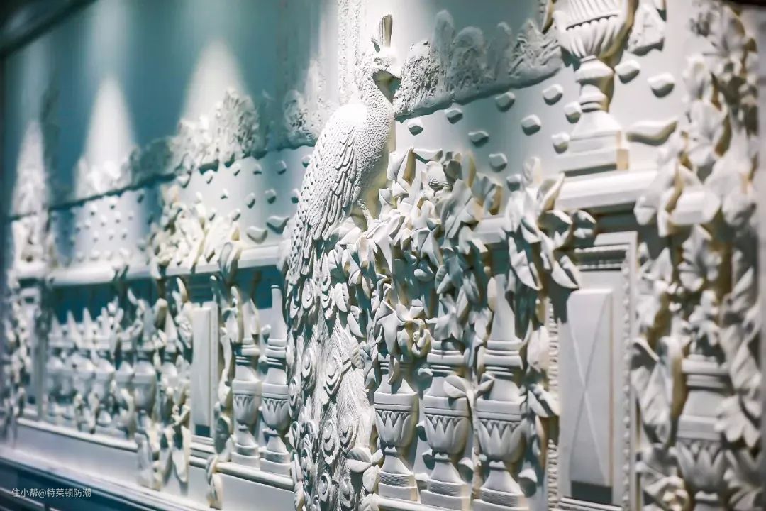 北京庄园别墅样板间内大面积使用手工工艺,比如户户标配的国际标准泳池,泳池旁墙面的雕塑、室内墙面的木作、随处可见的金箔线条等。据说所有这些手工工艺,都是花费不菲,邀请法国拥有几十年经验的匠人,到现场亲手完成,或现场指导。这些匠人,有的单日酬劳就是800欧。