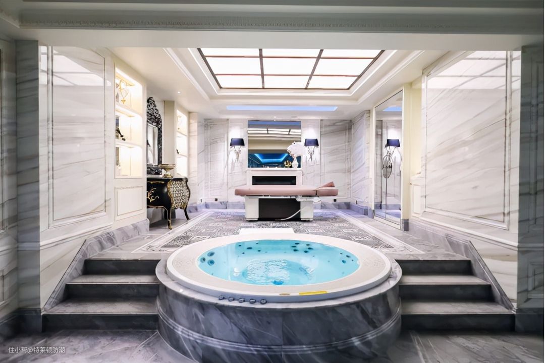 泳池旁配备了超大面积的蒸汽室、更衣室,可以享受天然温泉、SPA。