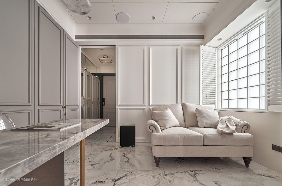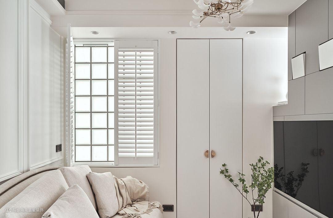 挥别玻璃砖粗犷填缝细节,木百叶窗覆盖而上,同步以储藏室抚平畸零,由此存放吸尘器或行李箱等大型物品,在一片纯白之中,使细腻线条层层堆砌,散透着柔和光点。