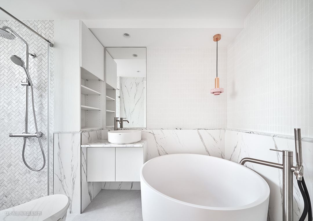 为了实现女主人在家泡澡心愿,于内大幅挪动了设备布局,借此置入直径100公分、可容纳两人的圆形浴缸,加上大理石腰墙和马赛克砖,更在直条和人字拼交织铺排的拼贴之中,营造纯净而优美沐浴时光。