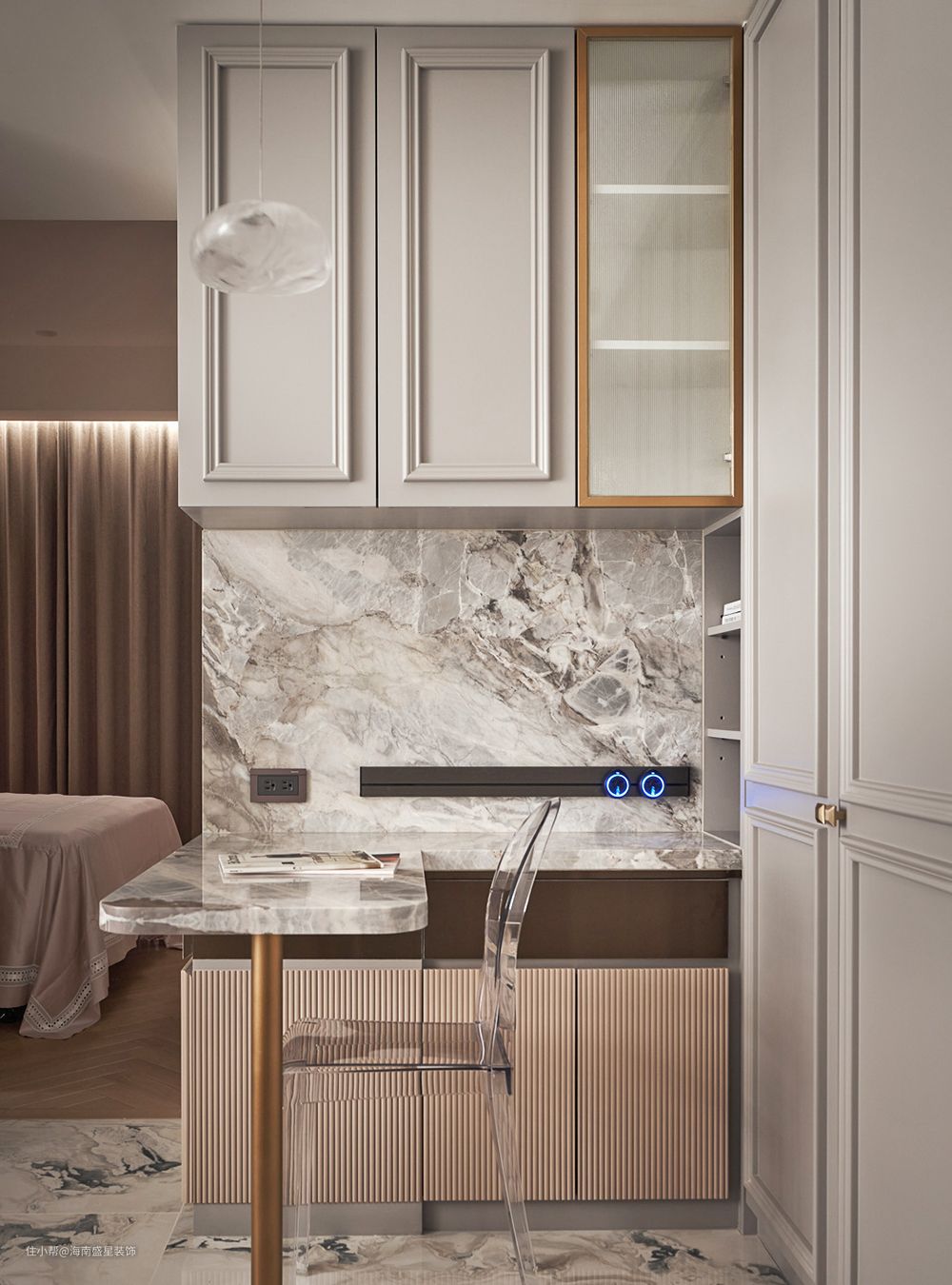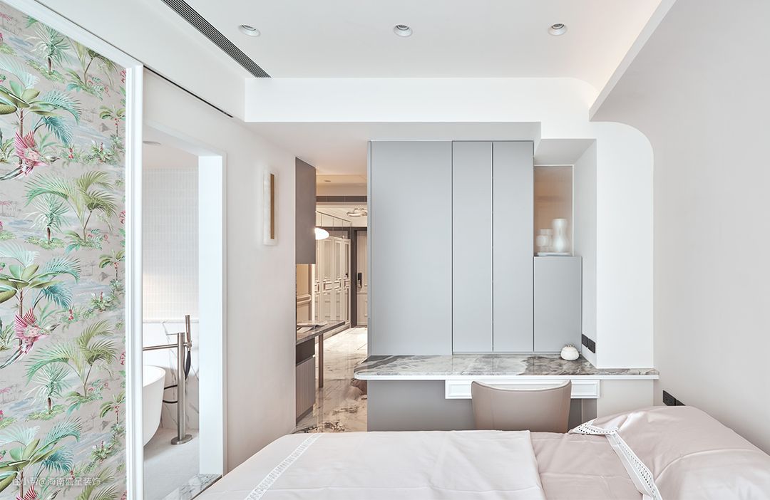 紧邻一侧,石材化妆桌收齐柱体宽度,而桌面之上的柜体便是活用了电视和音响后方的空白,将保养瓶罐藏于无形,更以侧柜达到最高收纳效益,也为门片后全身镜拉开刚好的使用距离。