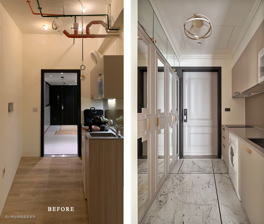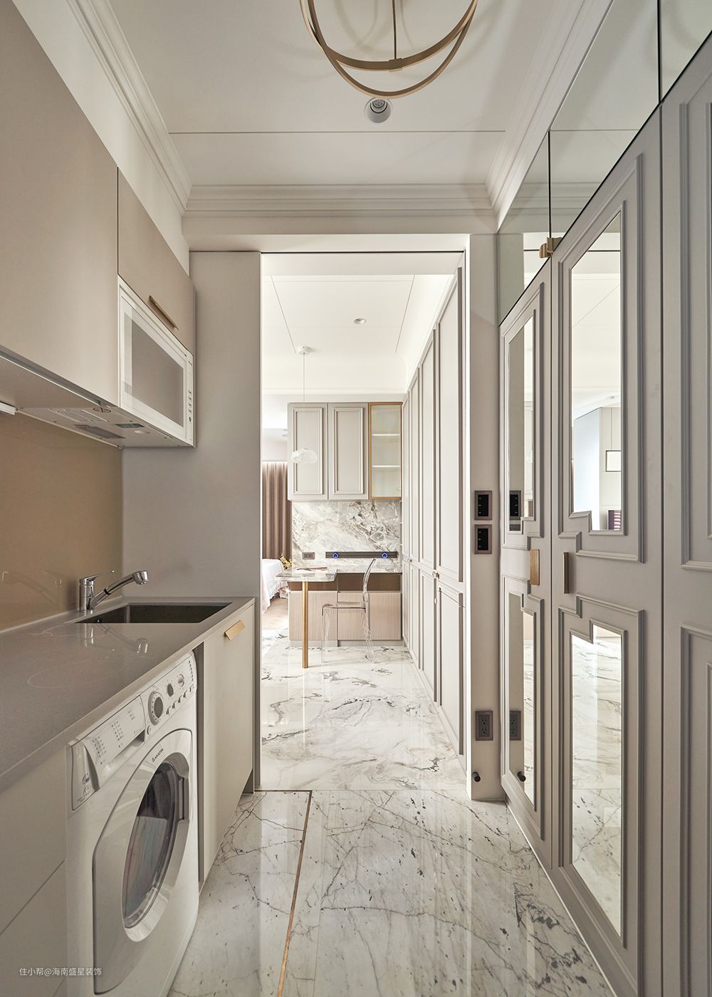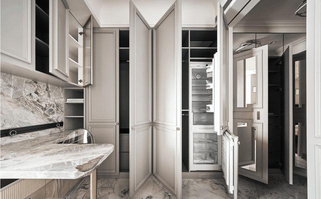 而为了在有限空间中完整纳入玄关与厨房需求,鞋柜和电器柜倚着另一道墙依序推入,并于柜内置入旋转鞋架,创造可藏纳50双鞋子的大容量,而后则以抽屉和抽盘布局,使厨房家电的收纳一次到位,并以明镜+线板优雅勾勒,增加廊道通透感。