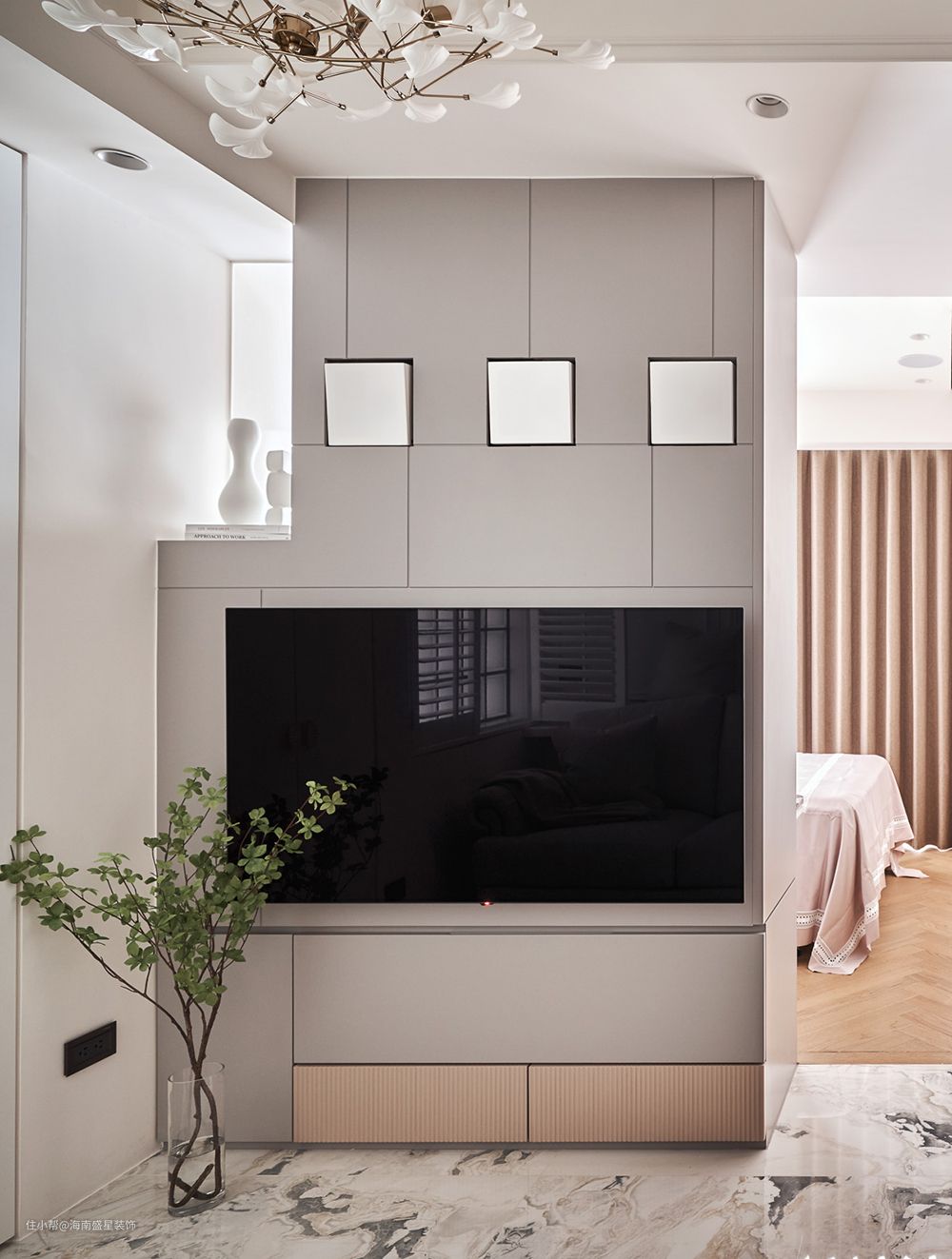 面对横卧大梁,设计师顺应结构落下一座柜体消弭压迫感,如此区隔了客厅与主卧,同步以双面柜手法整合电视墙与梳妆台,展现毫不虚掷空间精神。
