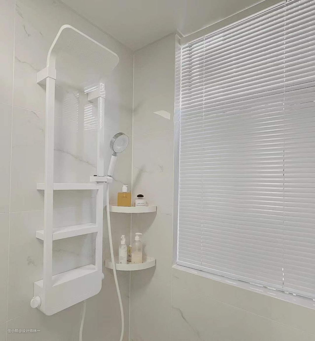 淋浴区利用墙角做了置物架,收纳洗发水、沐浴露等物,让淋浴区更加整洁、有序,使用感更好。