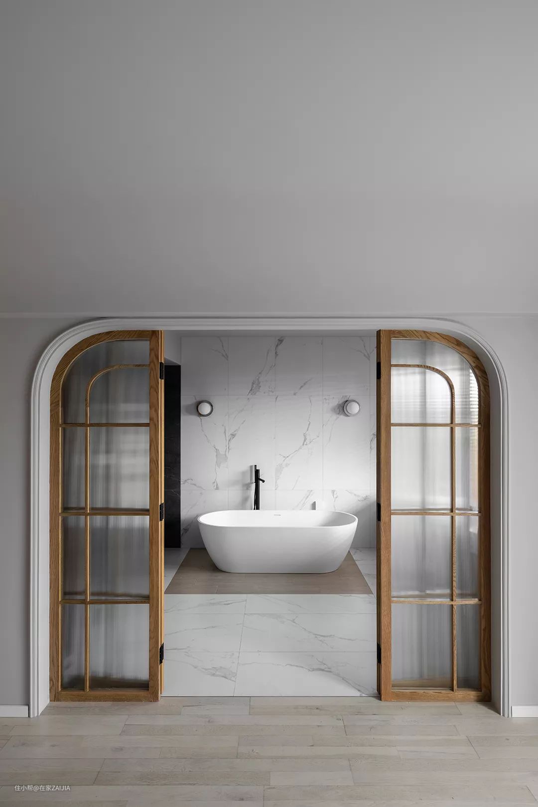 而且泡澡本来就很有仪式感,设计师将浴缸放在了卫生间视觉最中间,用木色的地砖代替了地毯做出了地面材质变化提高使用仪式。
