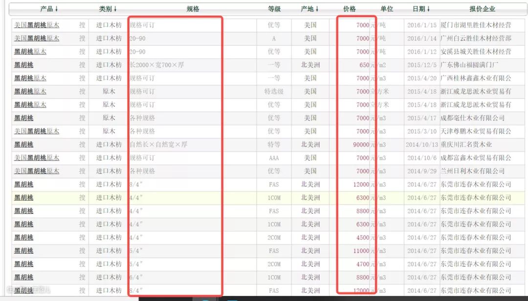 比如号称木材小贵族的北美黑胡桃,是在产地相同的情况下,等级不一样,规格不一样,到岸价(2014年)也在5000-13000元/m³之间浮动。