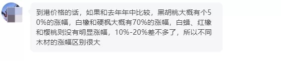 不同木材的到岸价格在近一年内普遍增加了10%-25%,高的甚至上涨了60%。