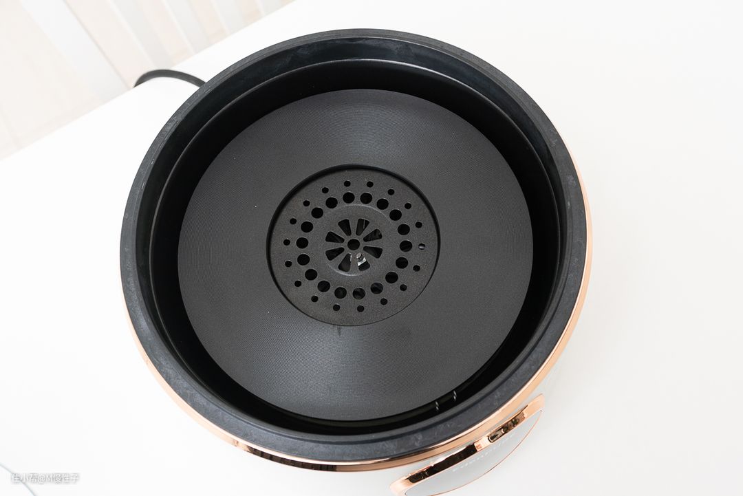 顶部采用了加热板的设计,从中间吸入空气,通过底部发热管+风机的作用,转变为热能,通过炸蓝四周穿透至食物的本身。放入煎锅、煮锅后底部的风扇不工作,仅加热管工作加热,集中热量于锅具的底部。