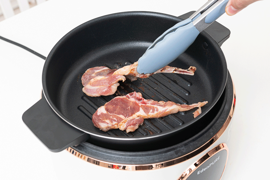 最后来用煎盘煎个羊排吧,配套的煎盘有瓦楞设计,可以煎出漂亮的花纹