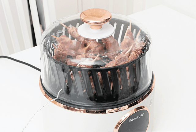 以及4L的大容积,也比同类产品2-3L的容积要更大,如下是空气炸锅的正确用法,在摆放时要留有一定的空间,让空气流动,并不能完全平放,实际小尺寸的空气炸锅一次能放的食材时非常有限的,但如宜盾普的这款空气炸锅,一次放十几只的羊肉串也不在话下。