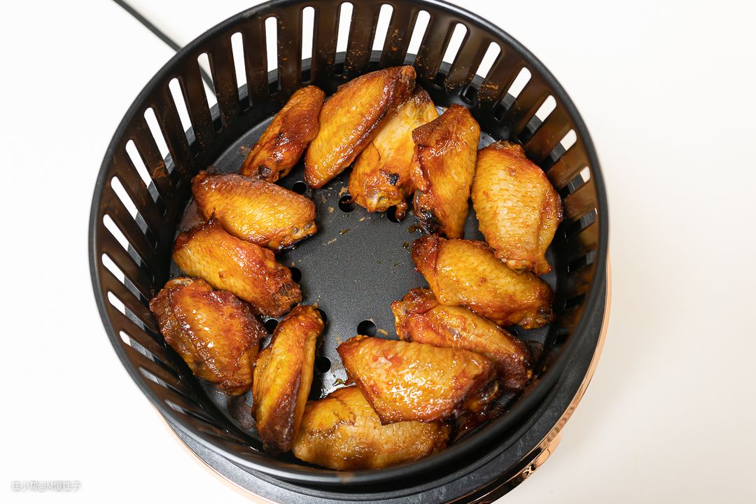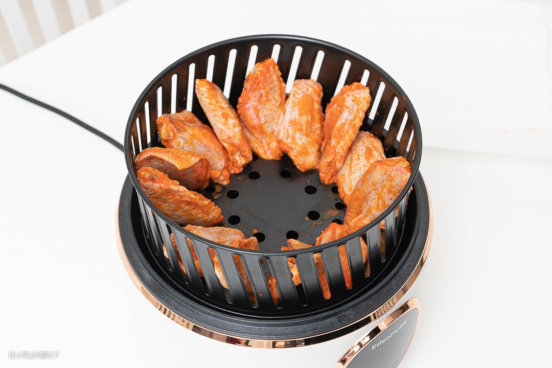 空气炸奥尔良风味鸡翅,使用奥尔良腌制料,均匀涂抹在鸡翅上,腌制2小时以上。可以看到宜盾普的这款空气炸锅,容量非常大,一次放十几个鸡翅依然有充分的空间保证热风的循环。