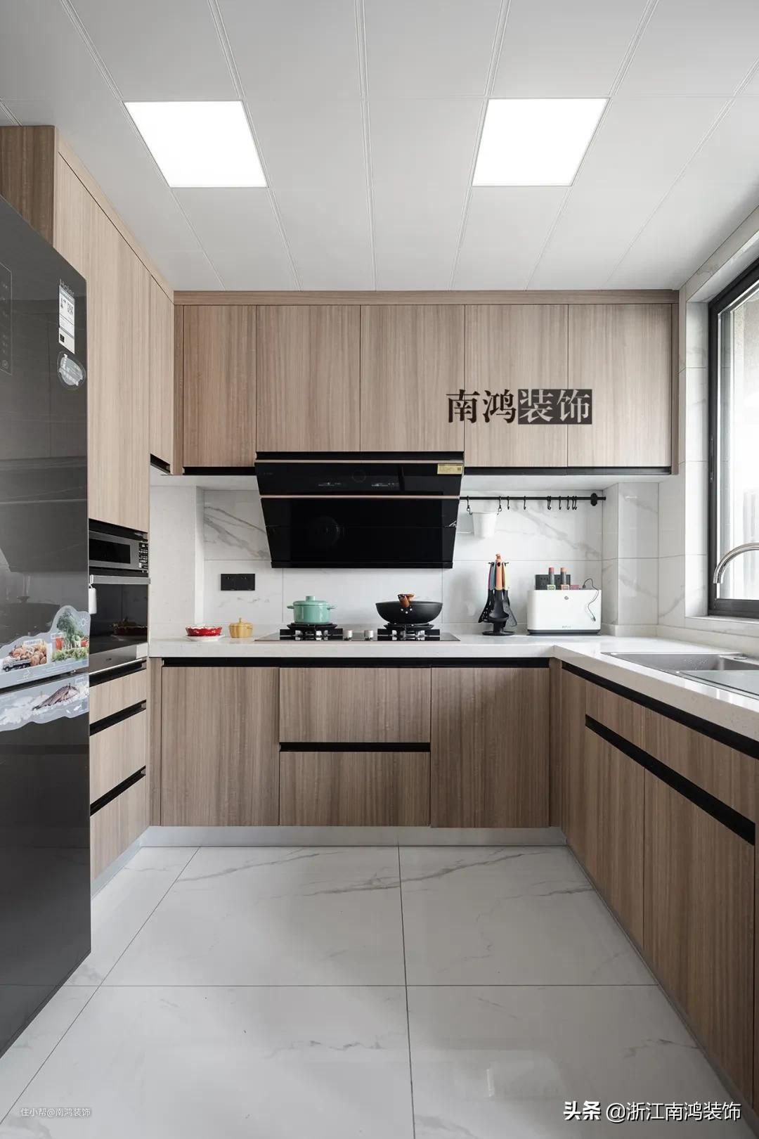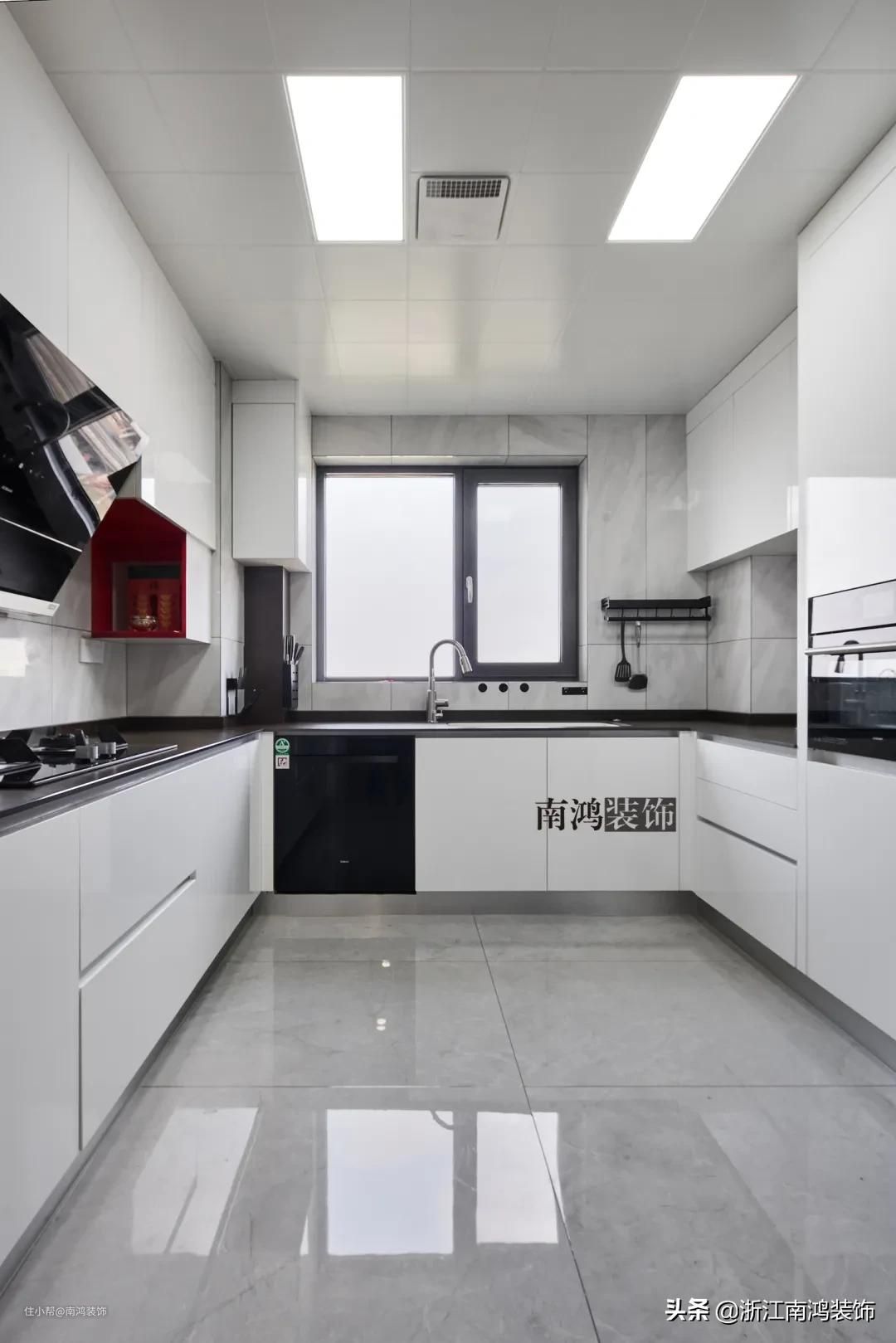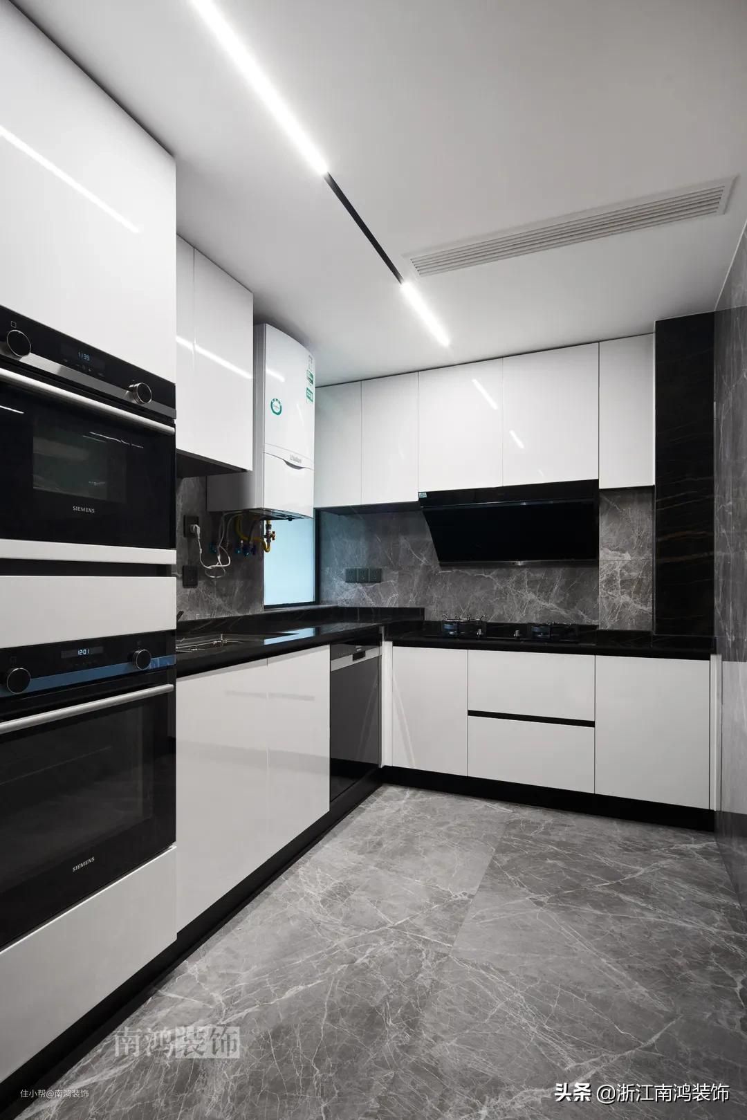 现代一般的厨房设计基本都离不开黑白灰三色,大到地面、台面,小到厨电、水槽、把手,每一个黑白灰色调的细节都能为厨房的气质加分。
