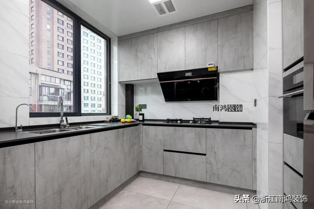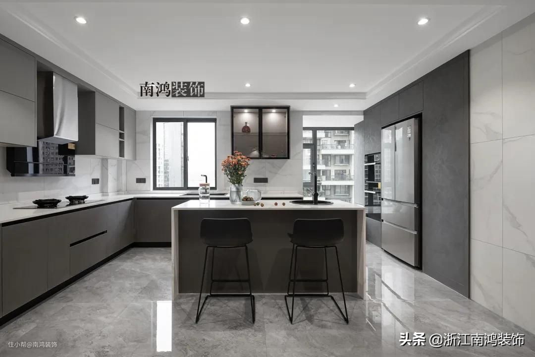 在家居设计中,黑白灰是永不过时的三颜色,冷静克制,最能彰显现代风格的简约特点。这三种非常低调的色彩,与厨房相遇时,便会让整个空间都散发出时尚高级的魅力。