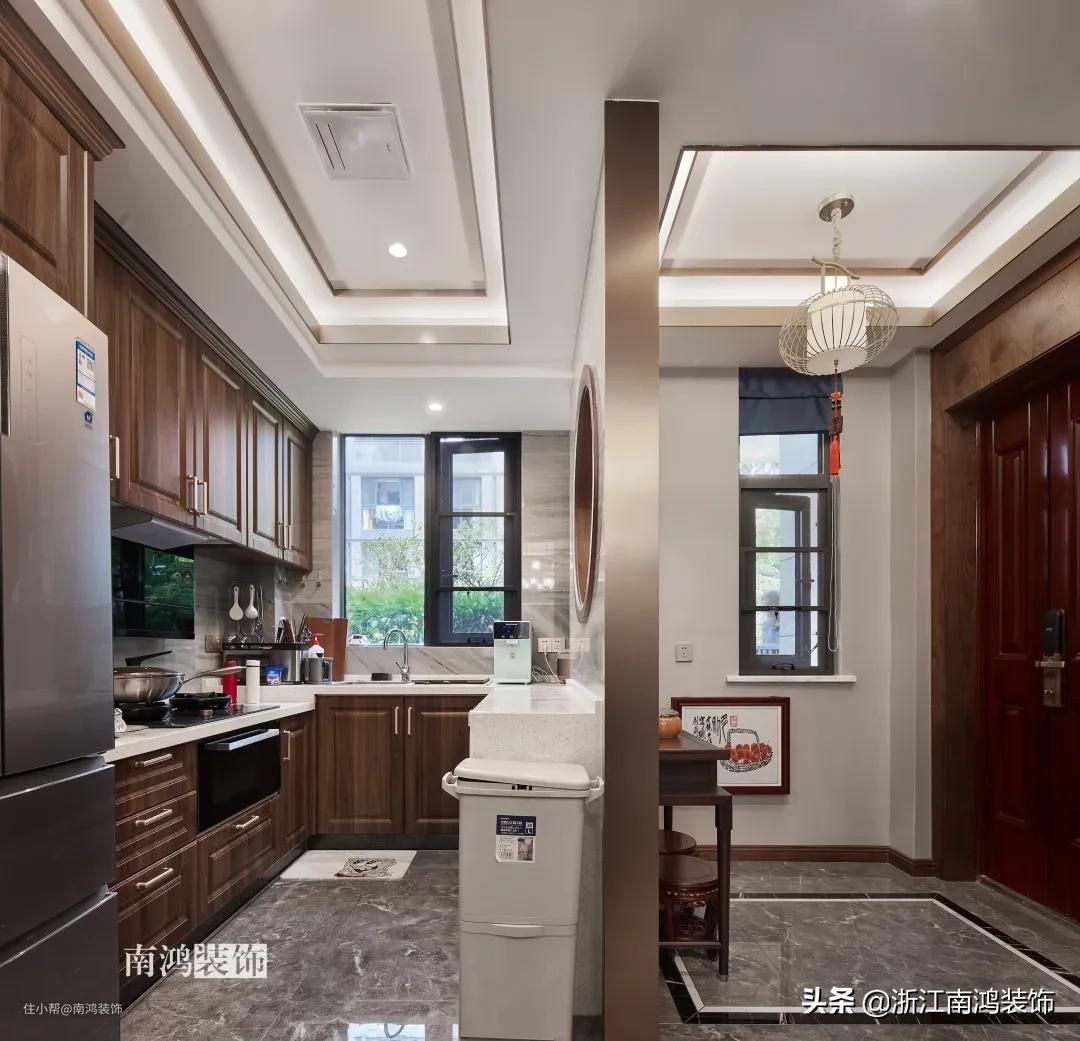 ▲朴素纯白的吊柜搭配自然木纹的地柜也是一对经典组合,相当大气。