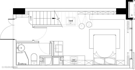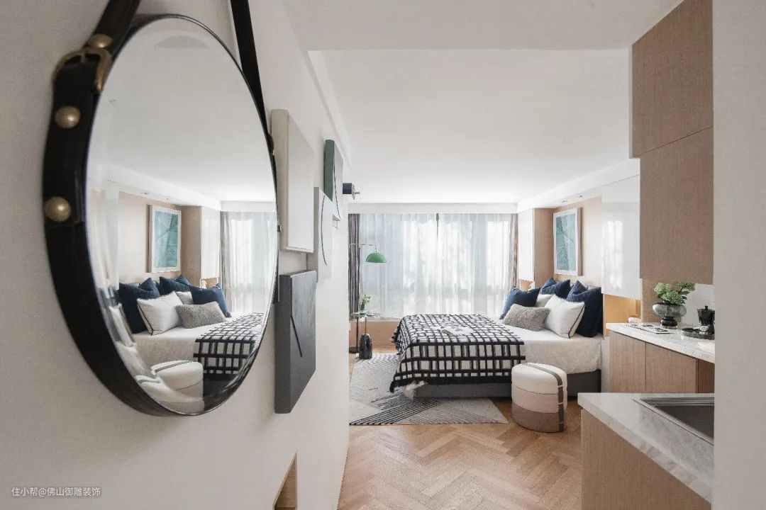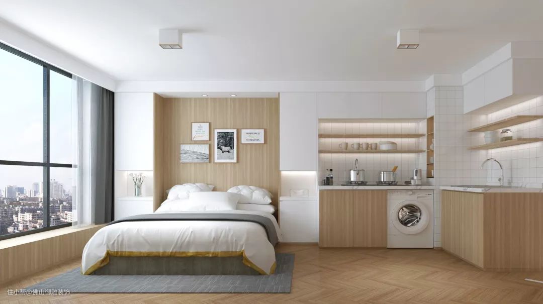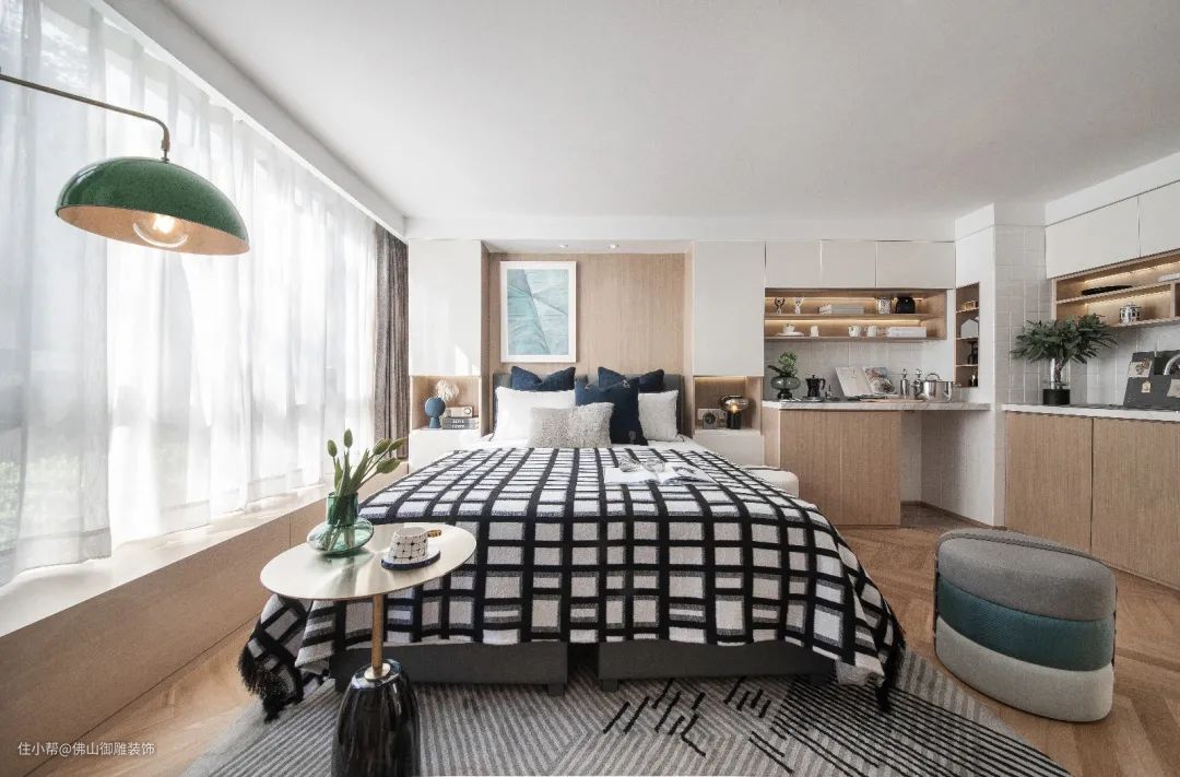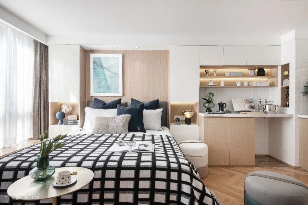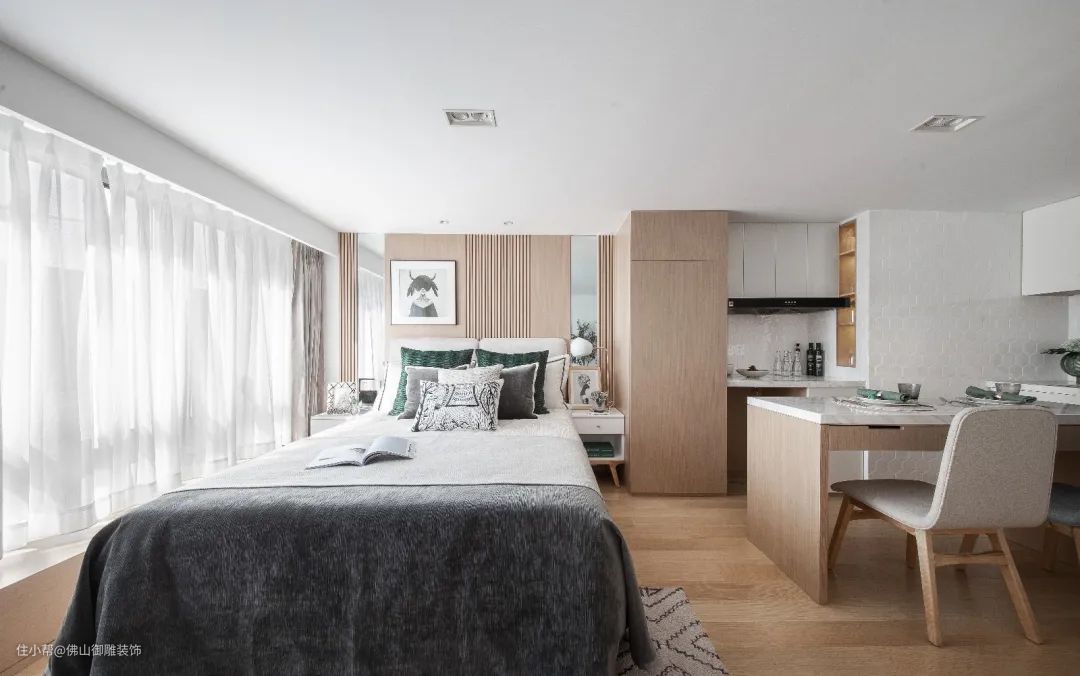 ▲在靠窗为主摆放床铺,床头墙以木饰面与长城板的背景基础,床上铺设朴素优雅的床单,天花以无主灯的设计,床旁边就是餐厅与厨房区域,小小的空间却也功能齐全。